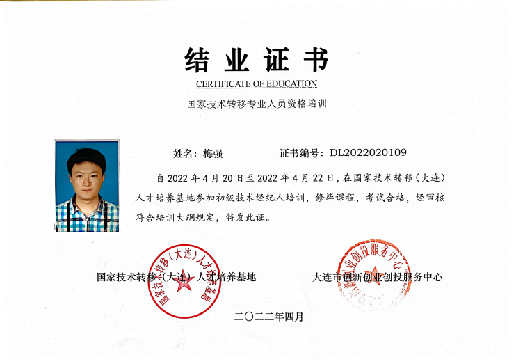 为贯彻落实《中华人民共和国促进科技成果转化法》《国家技术转移体系建设方案》等相关文件提出的“开展技术转移人才培养”指示精神,加快科技成果转移转化专业人才队伍建设,促进科技成果转移转化和科技服务业可持续发展,我院选派相关教师参加国家技术转移(大连)人才培养基地特举办2022年第二期初级技术经纪人培训班,经过考核,三名教师获得由大连市创新创业创投服务中心和国家技术转移(大连)人才培养基地认证的结业证书。